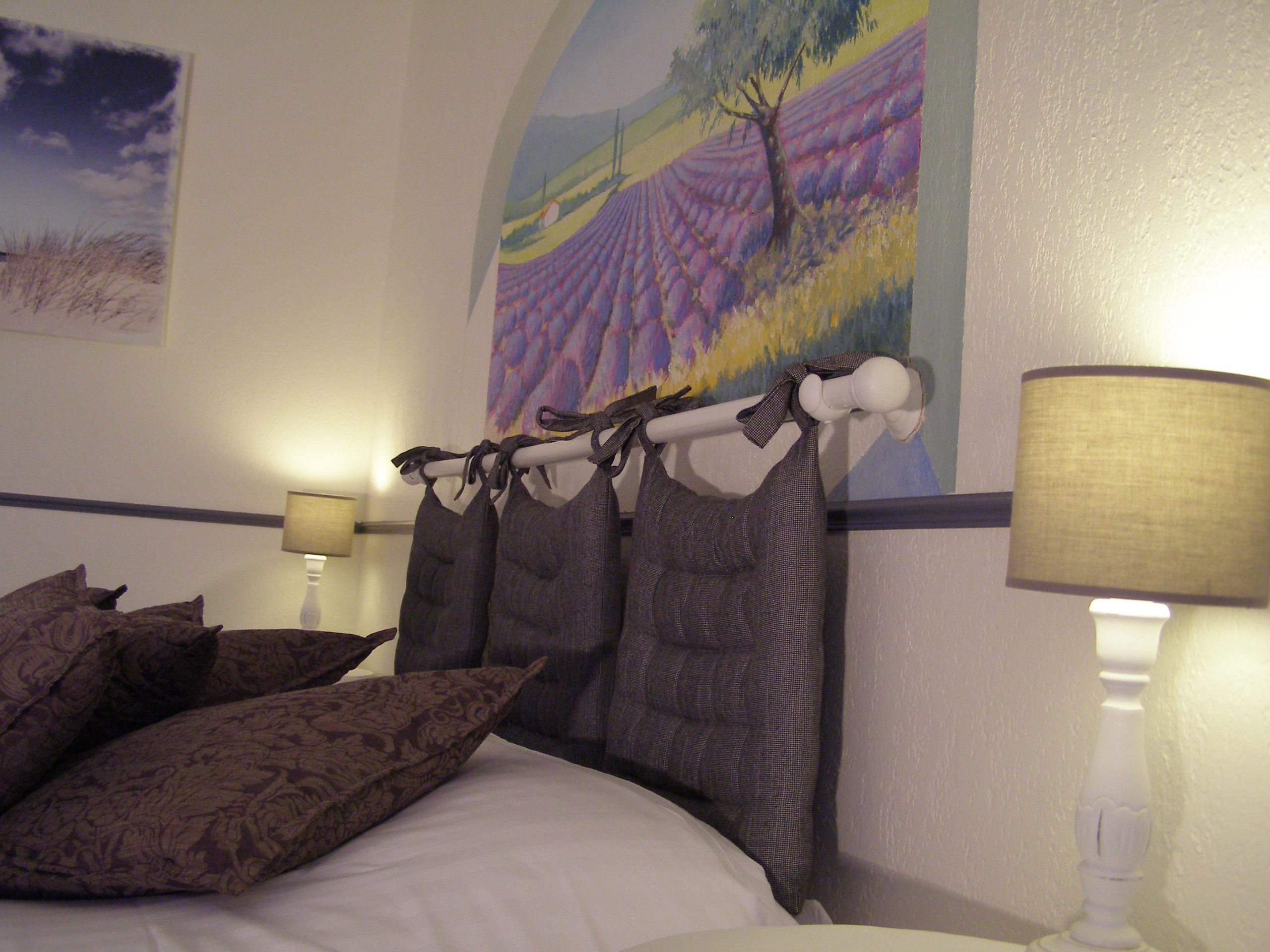Chambre de 25 m2 avec un lit King Size. Décrorée en couleurs blanc et lavande. Dès que vous sortez de cette chambre, vue avez de suite une vue superbe sur la piscine et la mer Méditerranéen. Les volets à l'extérieur de cette chambre peuvent être fermé et rendent la chambre entièrement noire.