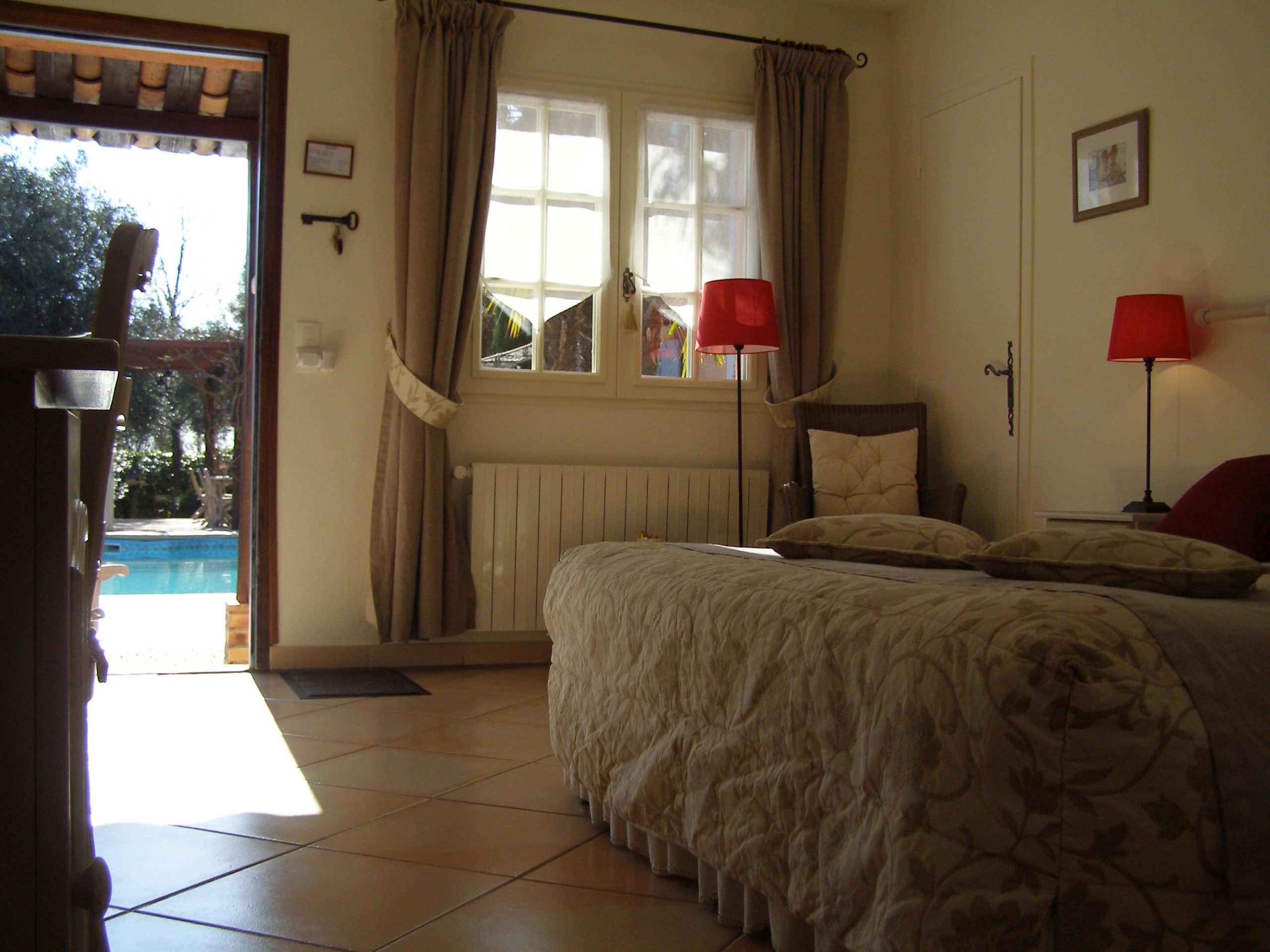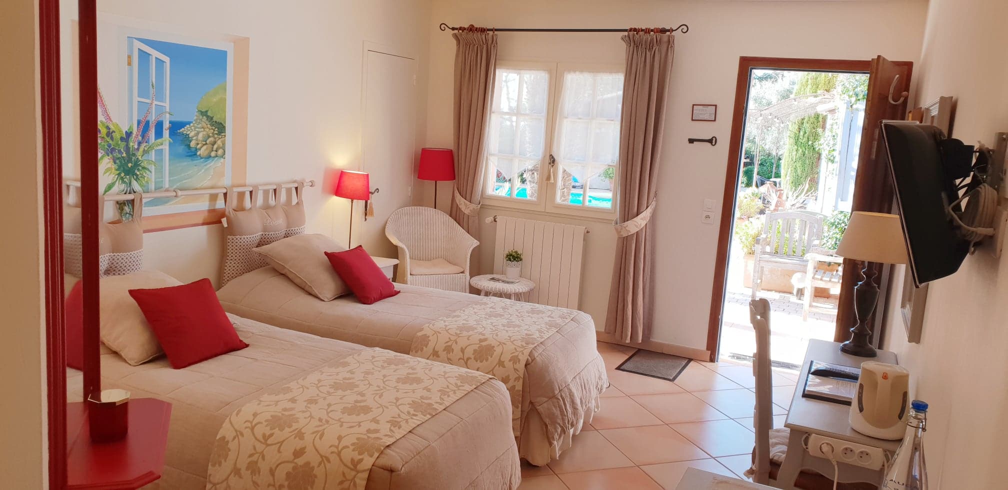 kamer van 25m2 met King size bed. De decoratie van de kamer bevat rode en witte kleuren. Je kan ervoor kiezen om de luiken aan de buitenzijde van de kamer volledig af te sluiten waardoor de kamer verduisterd is. Van zodra je de kamer buitenkomt heb je meteen zicht op het zwembad en de Medeterraanse kustlijn.
