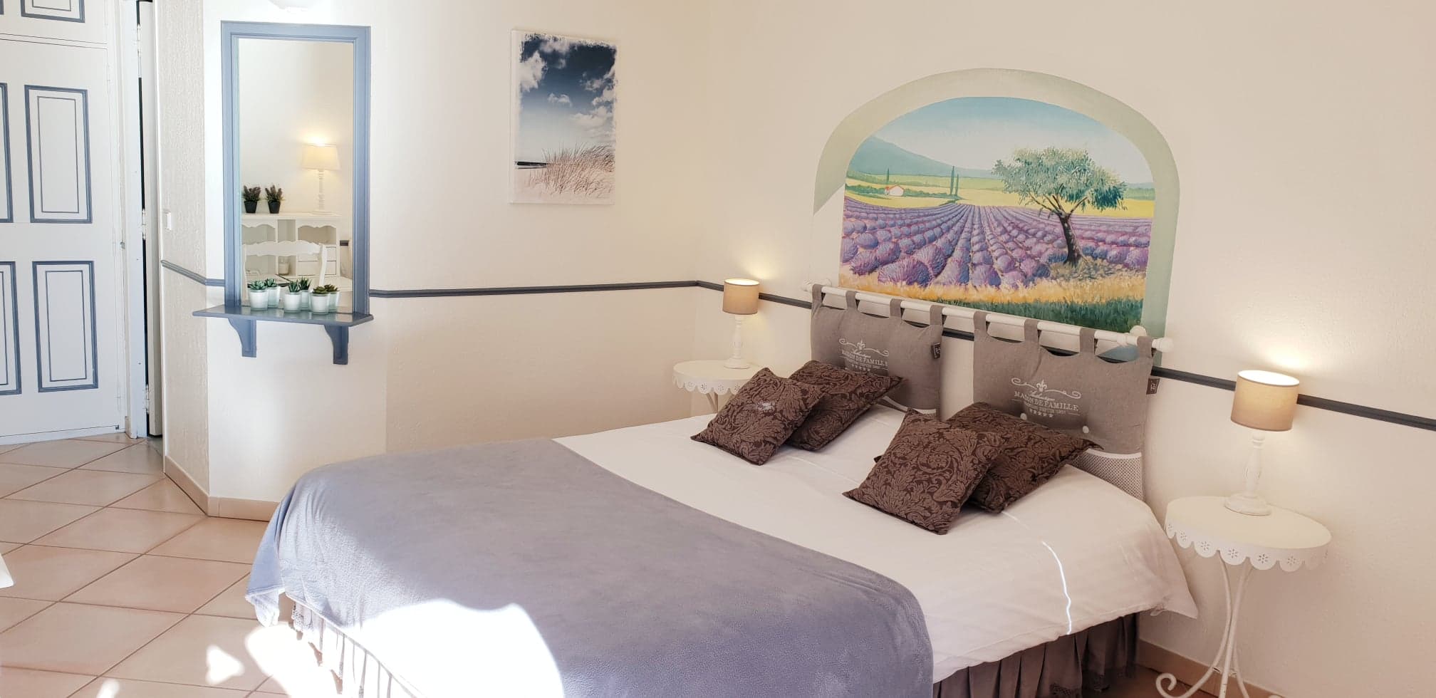 Een kamer van 25m2 met een King Size bed. Geschilderd in het wit en met lavendel-decoratie. Je kan ervoor kiezen om de luiken aan de buitenzijde van de kamer volledig af te sluiten waardoor de kamer verduisterd is. Van zodra je de kamer buitenkomt heb je meteen zicht op het zwembad en de Medeterraanse kustlijn.